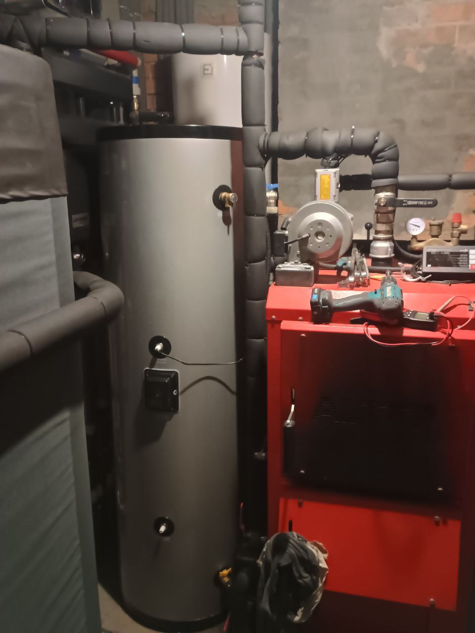 Інтеграція в котельню: Незважаючи на значні габарити (300 л) та захаращеність приміщення іншим обладнанням, бак вдалося компактно розмістити поруч із твердопаливним котлом. Усі з’єднувальні магістралі ретельно заізольовані для збереження накопиченого тепла.