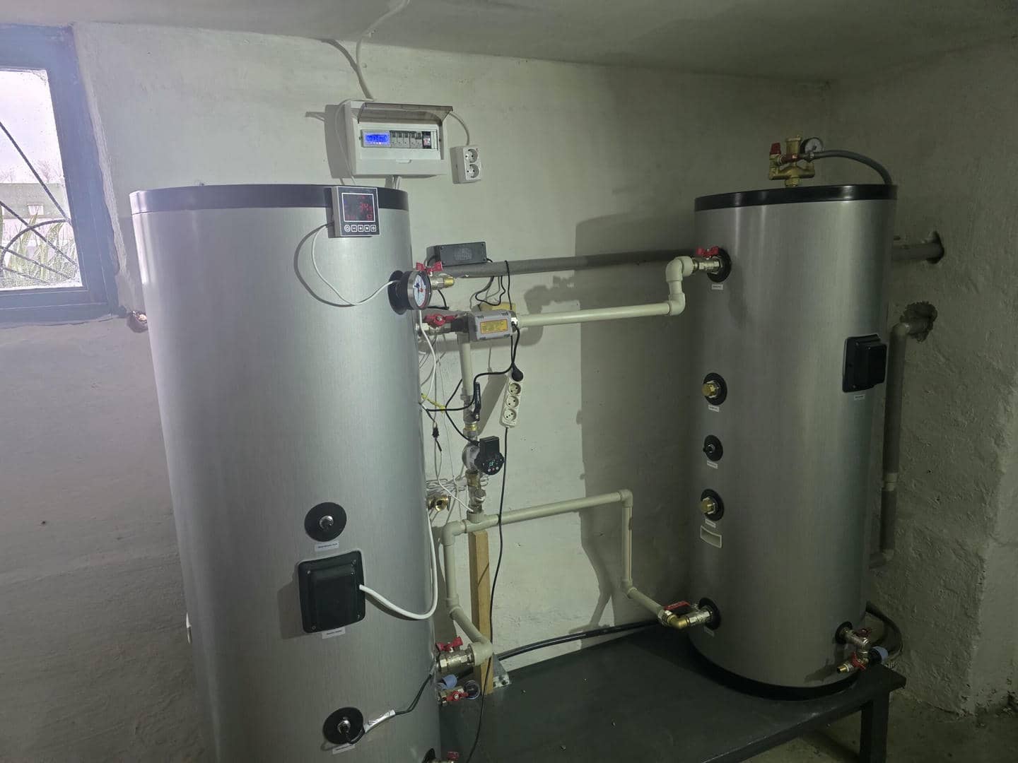 Підготовка до встановлення Перед монтажем було визначено оптимальне місце у технічному приміщенні, яке дозволяє зручно під’єднати обидва баки до системи опалення та водопостачання. Поверхня була ретельно підготовлена для забезпечення стійкості обладнання та мінімізації вібрацій.
