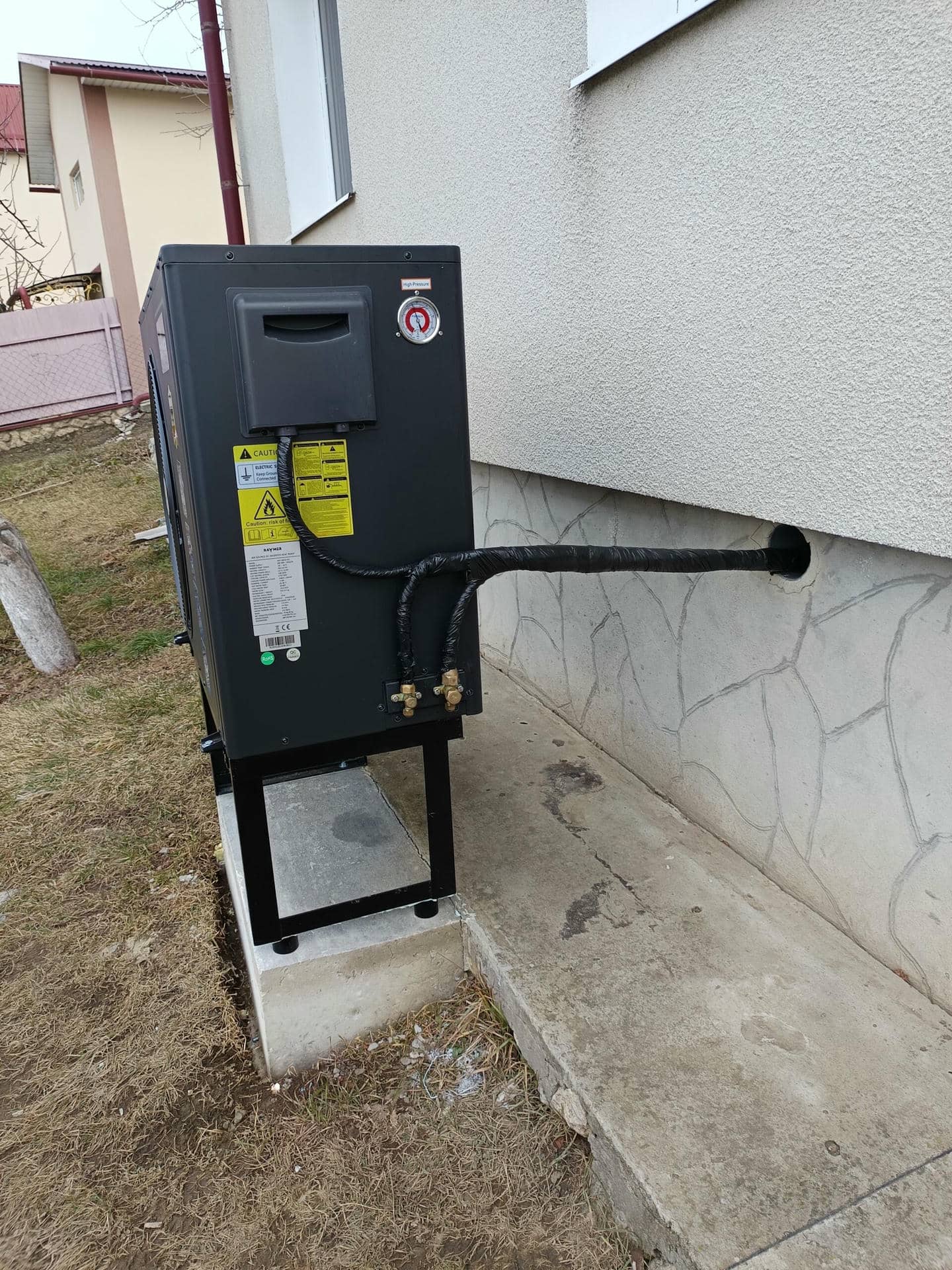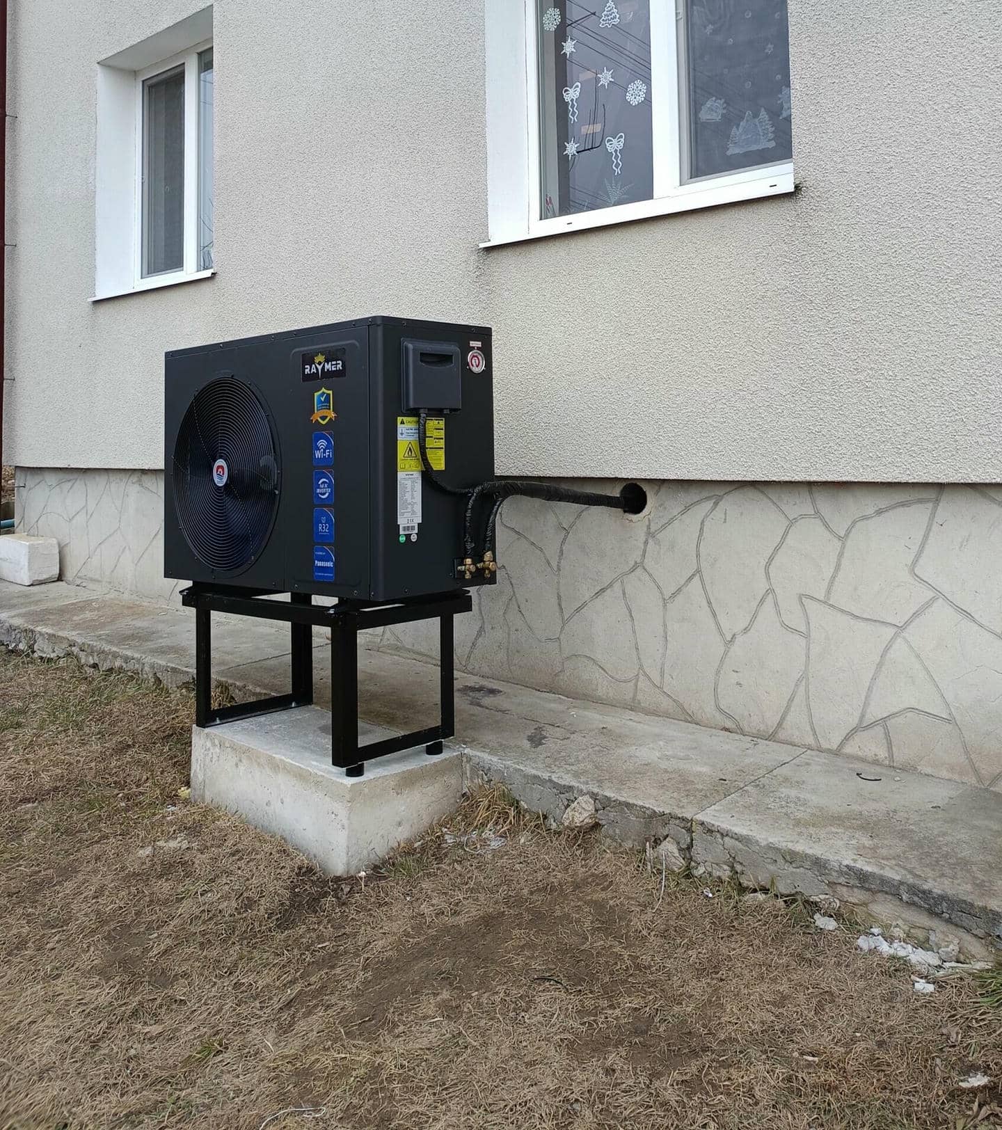 Монтаж зовнішнього блоку теплового насосу Raymer RAY-15DS1-EVI був виконаний замовником самостійно. Блок встановлено на надійну основу з бетонних блоків, що забезпечує його стійкість та зменшує ризик вібрацій під час роботи. Підключення теплоізольованих трубопроводів виконано через стіну будинку, що дозволяє мінімізувати теплові втрати та забезпечує акуратний вигляд інсталяції.