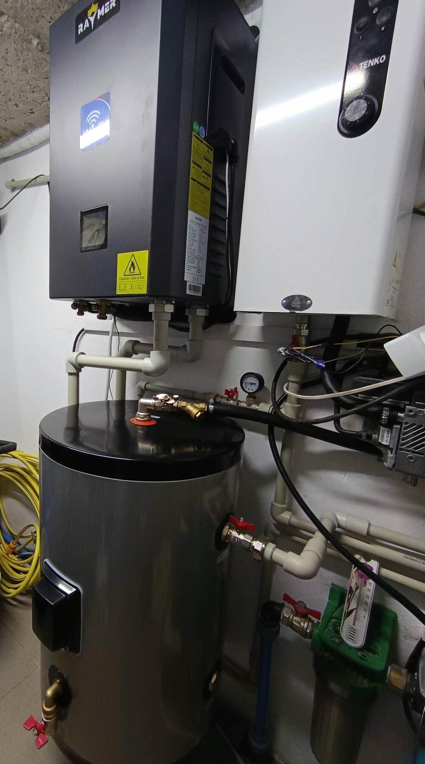 Гідромодуль Raymer встановлено на стіні поруч із електрокотлом Tenko, що дозволяє ефективно використовувати простір у котельні. Монтаж виконаний самостійно, з урахуванням оптимальної схеми підключення до баку-гібриду, що забезпечує гаряче водопостачання та підтримку температури в системі опалення.