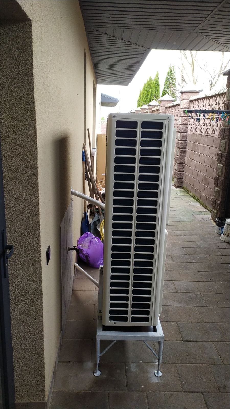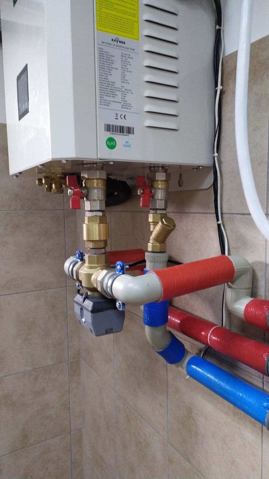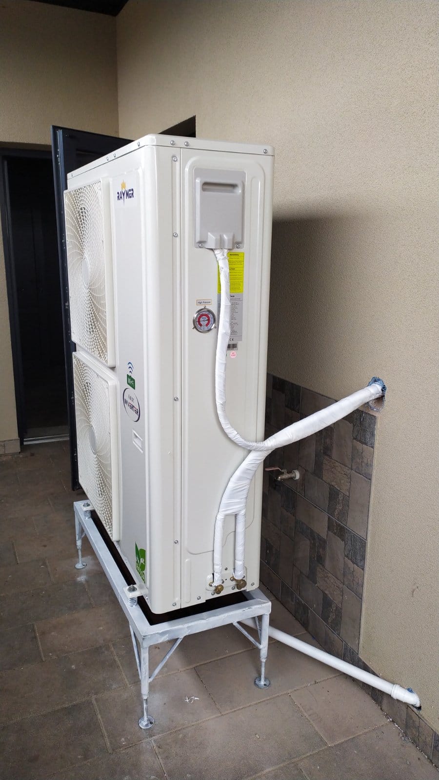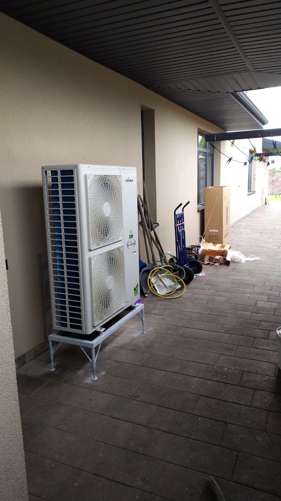 Установка теплового насосу: Було здійснено монтаж спліт-системи теплового насоса повітря-вода Raymer RAY-18DS1 EVI 380 В 18 кВт. Для зовнішнього блоку даної спліт-системи була спеціально виготовлена та монтована підставка. Цей етап роботи включав не лише встановлення самого насоса, але і його налаштування та підключення до системи опалення та ГВП.