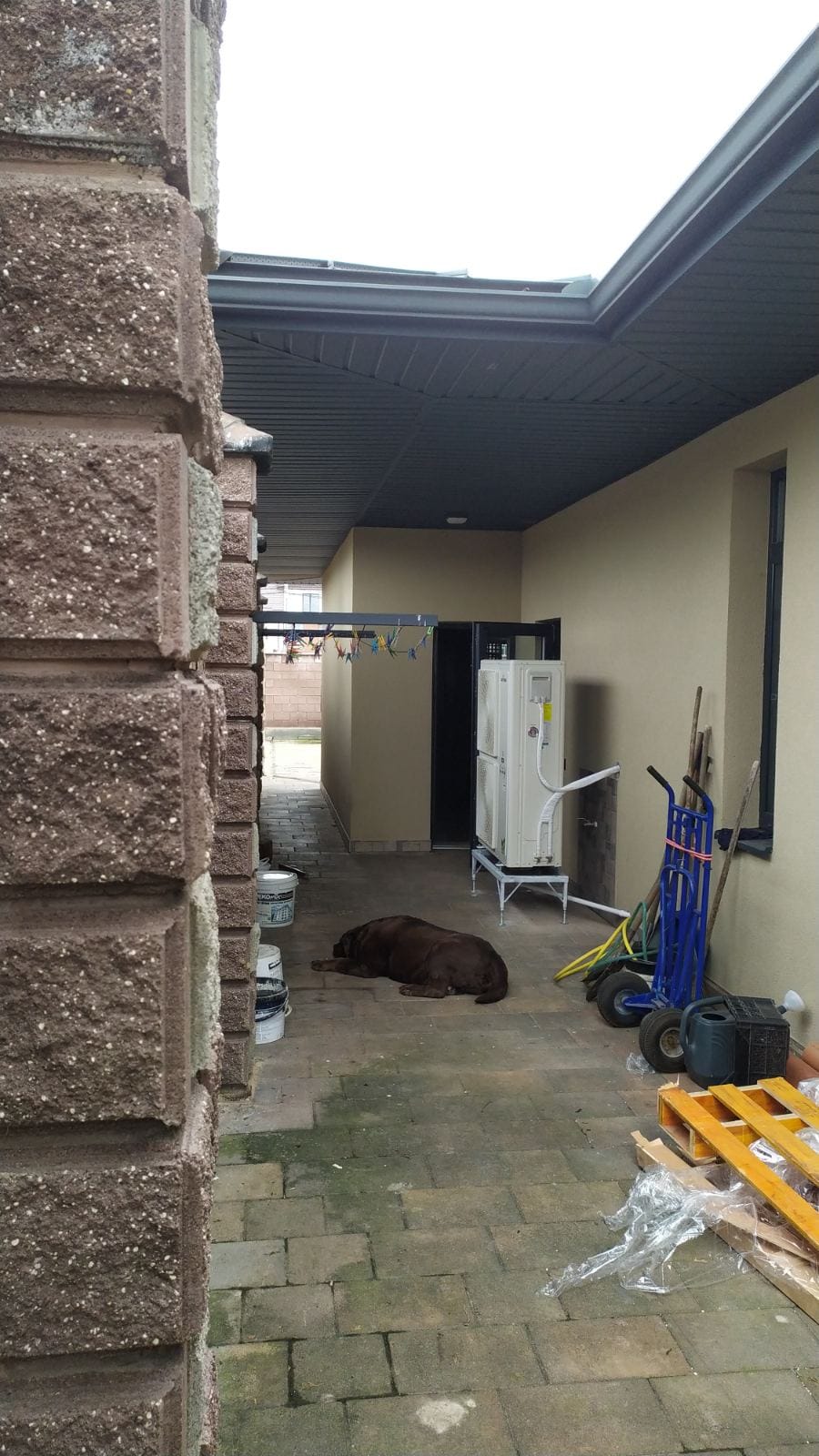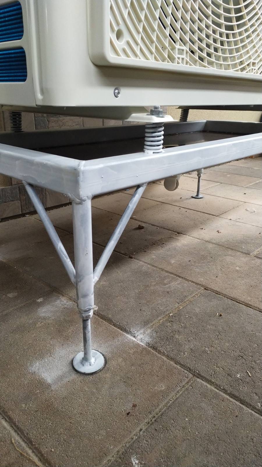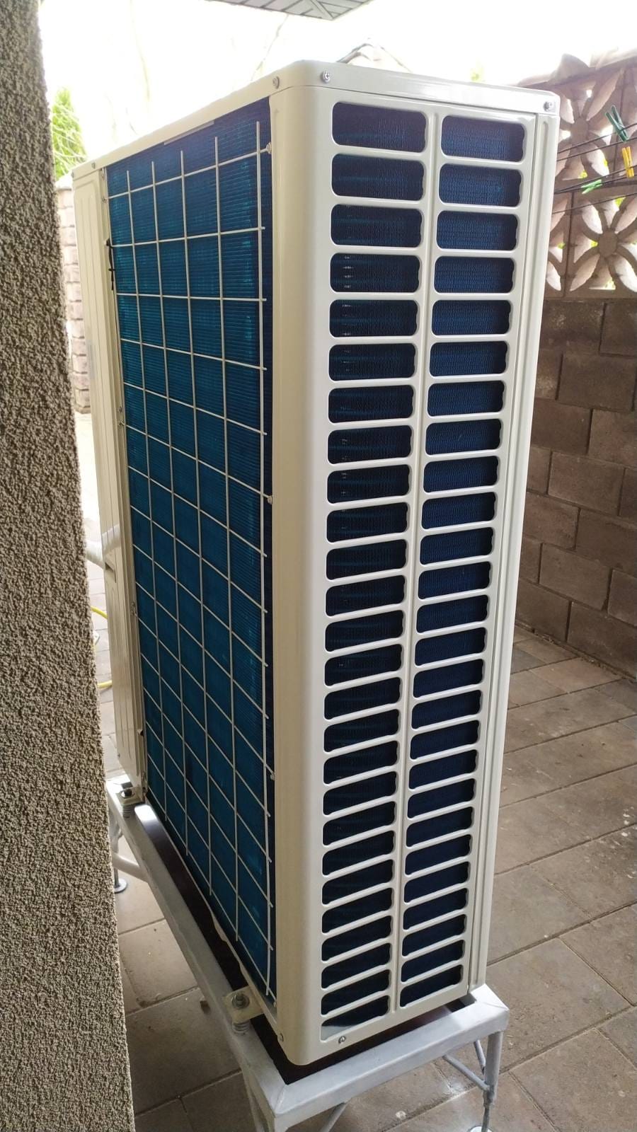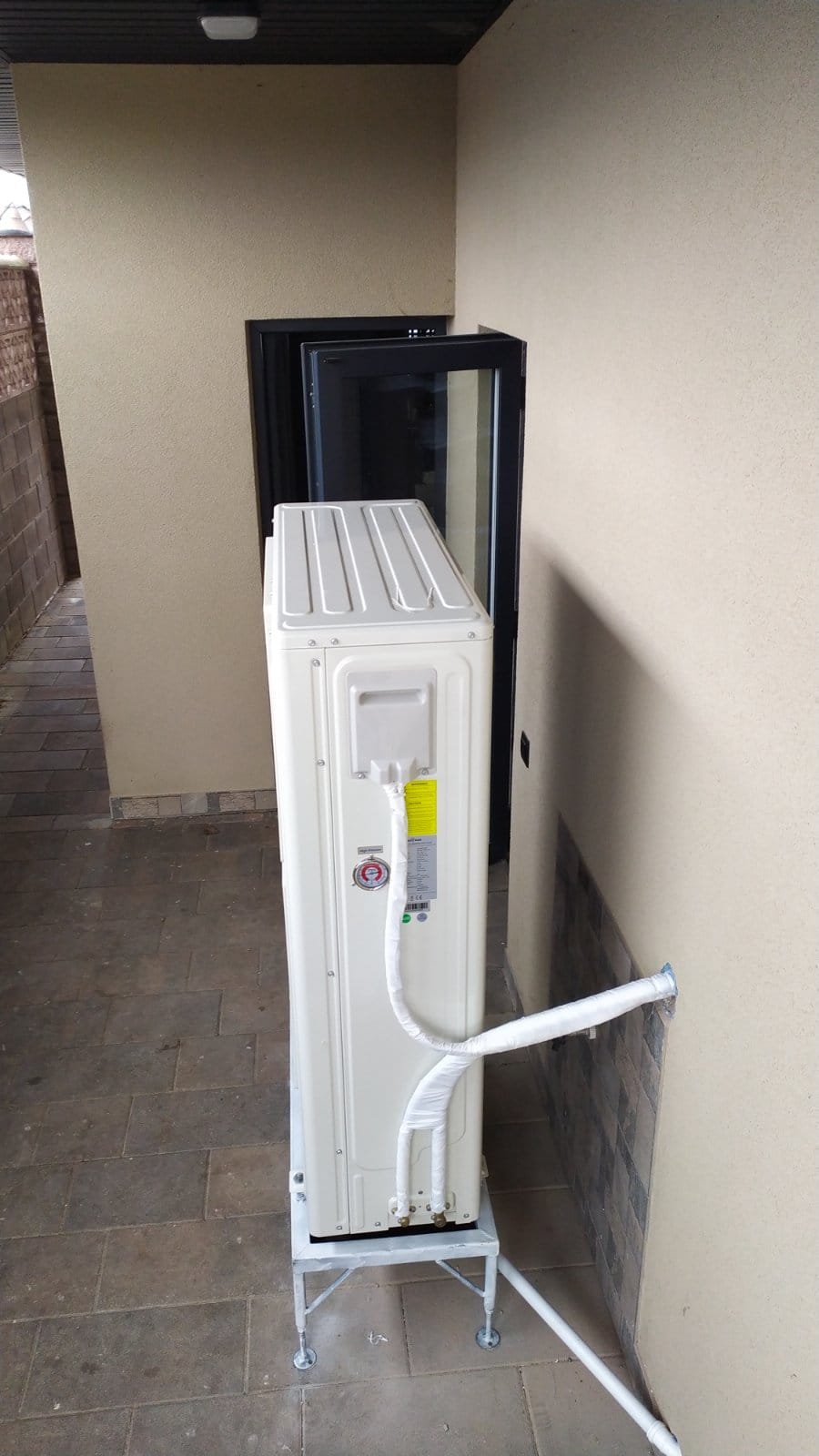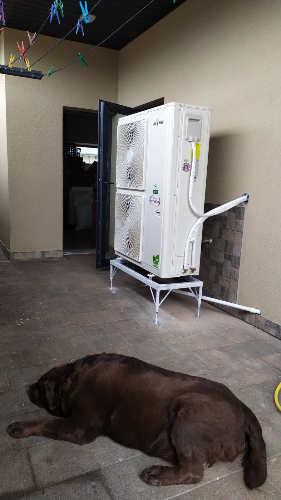 Установка теплового насосу: Було здійснено монтаж спліт-системи теплового насоса повітря-вода Raymer RAY-18DS1 EVI 380 В 18 кВт. Для зовнішнього блоку даної спліт-системи була спеціально виготовлена та монтована підставка. Цей етап роботи включав не лише встановлення самого насоса, але і його налаштування та підключення до системи опалення та ГВП.