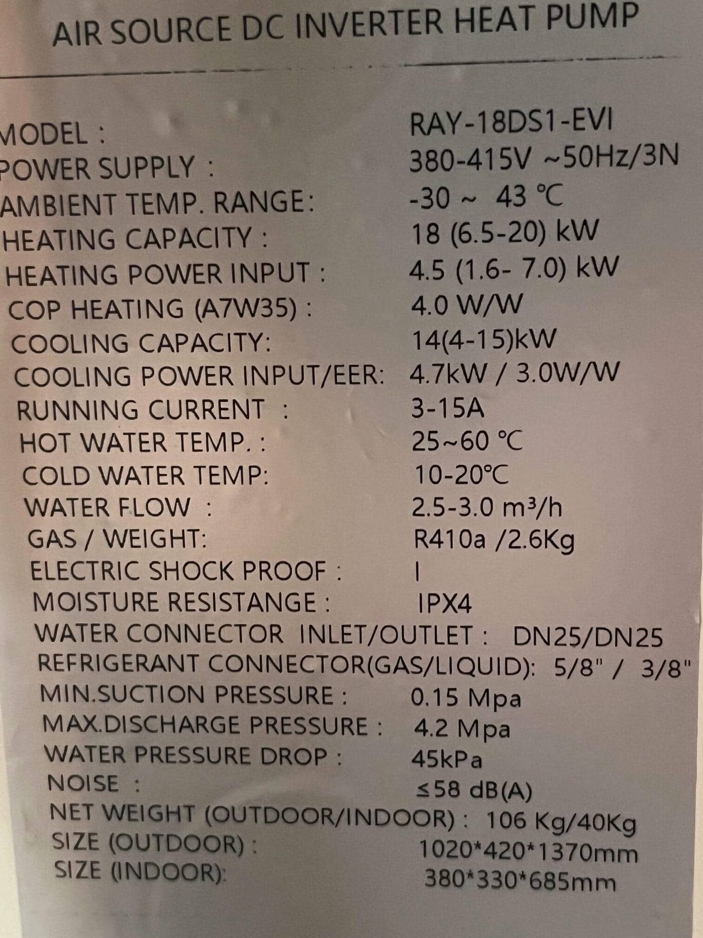 Потужність у 18 кВт робить цей тепловий насос ідеальним вибором для ефективного обігріву приміщень площею до 180 кв.м. Це забезпечує комфортне тепло у всіх куточках будинку, навіть у найхолодніші місяці.